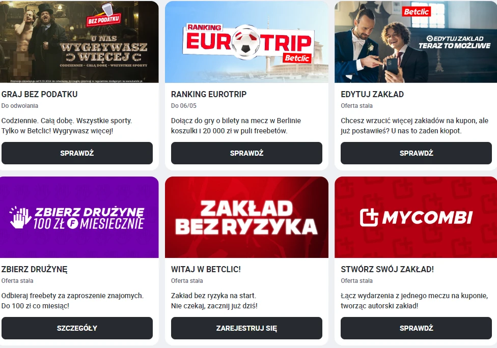 Betclic w stosunku do innych bukmacherów nie wykazuje się przesadną nagrodą w ramach bonusu powitalnego. Spółki oferuje przy rejestracji wypełnienie prostego formularzu. Dalszymi krokami jest wpłata depozytu oraz obstawienie pierwszego zakładu. Jeśli się okaże, że to był twój szczęśliwy traf to możesz cieszyć się z wygranej w przeciwnym razie otrzymasz zwrot do 50 zł we freebetach.