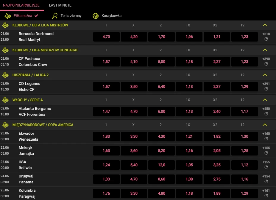 Jedna z najpopularniejszych dyscyplin na całym świecie, czyli piłka nożna jest w bardzo dobry sposób opakowana w serwisie BetX. Klienci mogą skorzystać z rozgrywek międzynarodowych, a najbliższa pora, czyli czas Euro 2024 będzie idealną imprezą na przetestowanie wszystkich możliwości. Ponadto BetX może się pochwalić bogatą ofertą rozgrywek międzyklubowych. Można także skorzystać z obstawiania w takich krajach, jak m.in. Argentyna, Islandia, Finlandia, Japonia, Norwegia, Paragwaj i wiele innych.