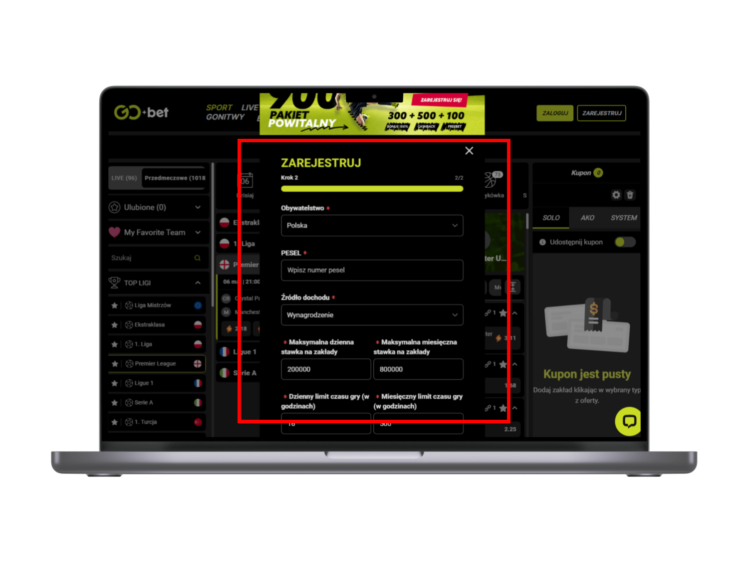 Założenie konta w serwisie Go+Bet poprzez komputer jest naprawdę proste, a jedyne co trzeba zrobić, to wykonać kilka przedstawionych poniżej kroków: