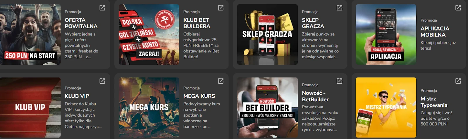 Każdy z bukmacherów ma w swojej ofercie wiele promocji dla swoich graczy. W przypadku spółki PZBuk można wyróżnić takie jak: Bet Builder,czy Mega Kurs.