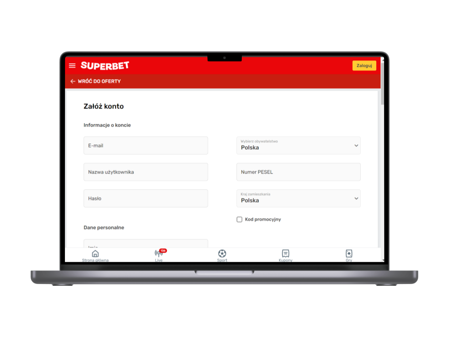 Superbet, jak praktycznie każdy bukmacher na polskim rynku, umożliwia założenie dwóch rodzajów kont - tymczasowego i stałego. Założenie konta tymczasowego jest bardzo proste i szybkie. Wymaga minimum formalności. Musisz podać imię i nazwisko, PESEL, adres e-mail, kraj zamieszkania oraz ustalić login i hasło.